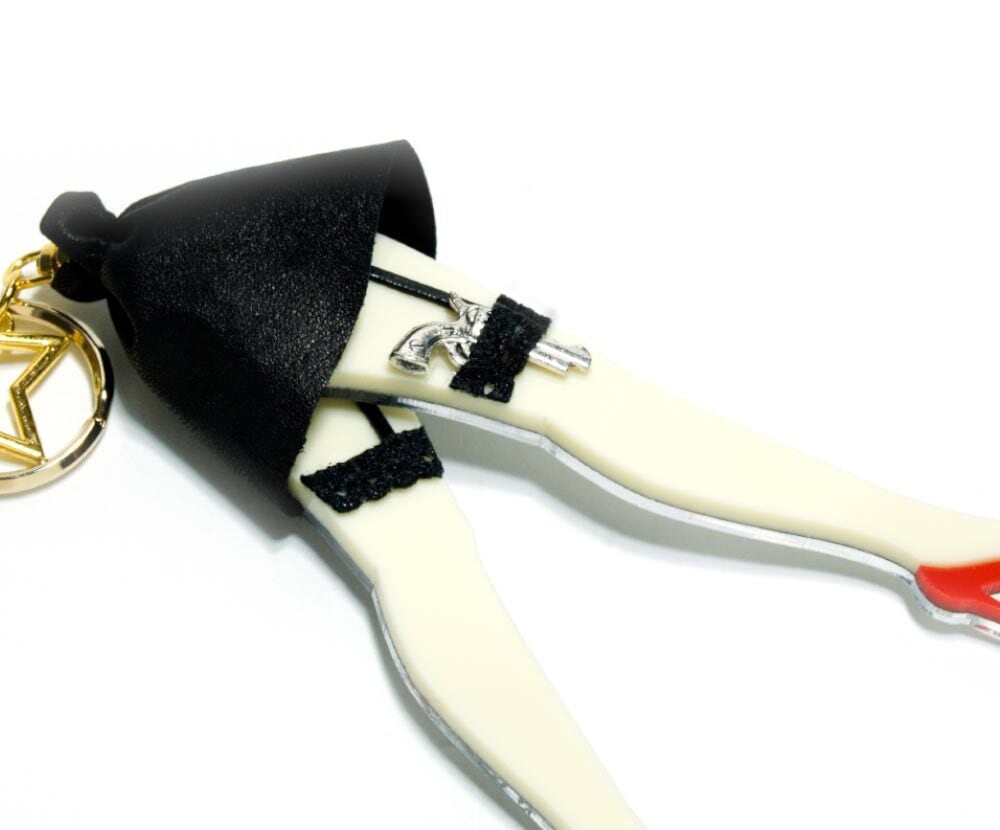 アクリル板で脚を切り抜き、革ひもやレースでレッグホルスターを表現しました。