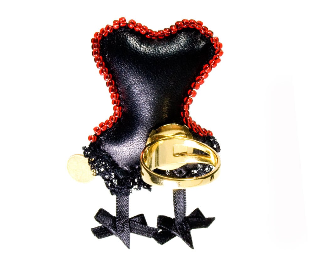 縁にビーズをあしらった刺繍モチーフにレースやボタンに見立てたビーズをほどこしてリングにしました。