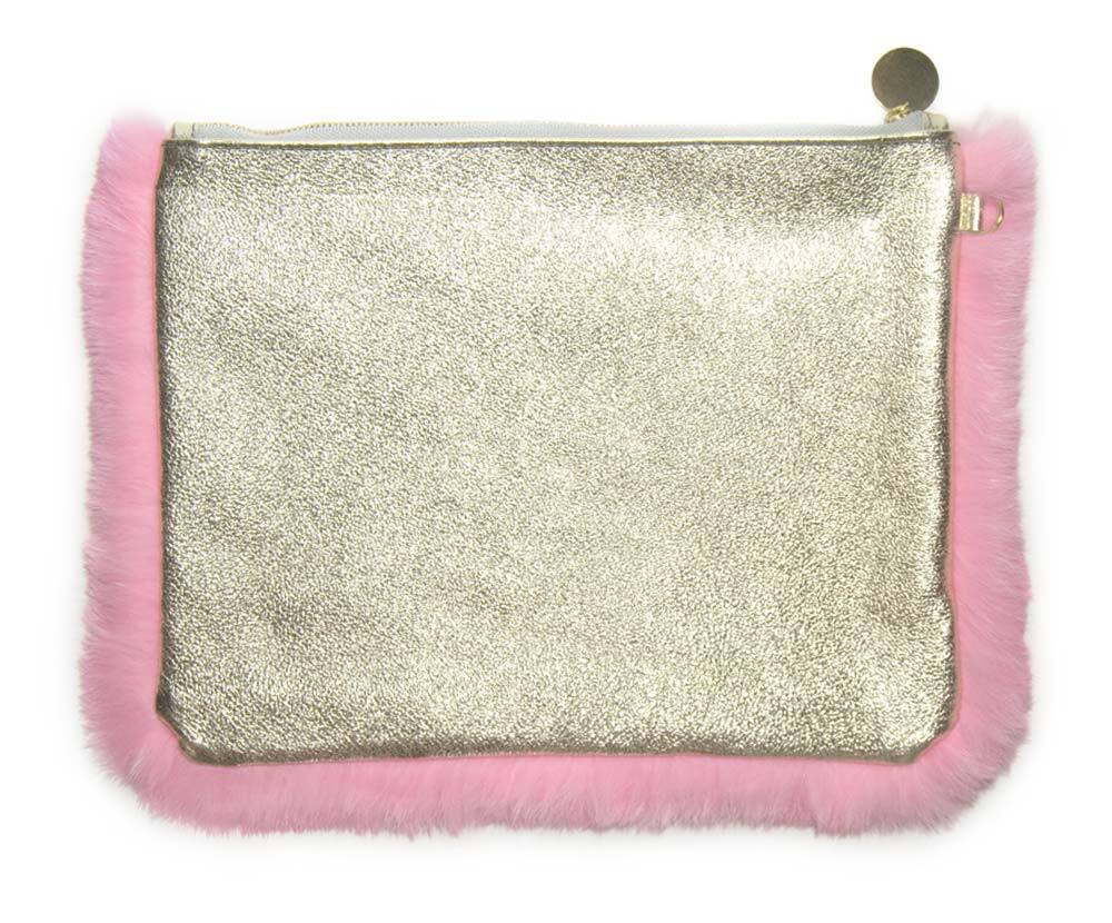 シルバーのメタリックにベビーピンクのファーのクラッチ。