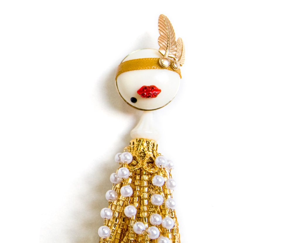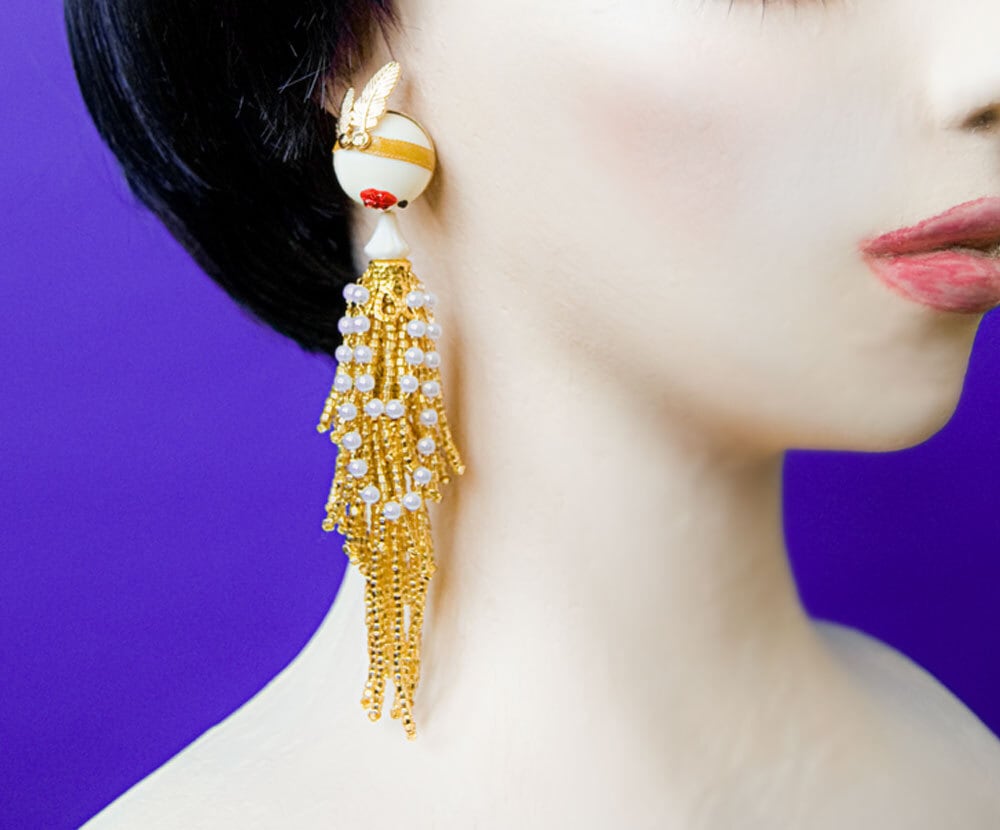 羽のヘッドピースに真っ赤な唇、わらいぼくろのフラッパーガールが耳元で踊るように揺れる。