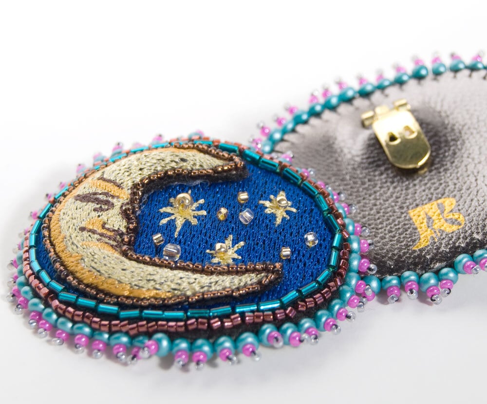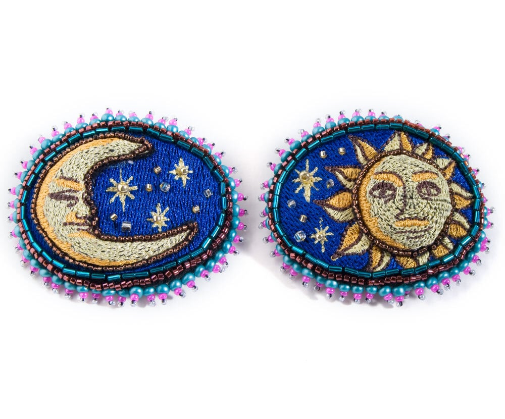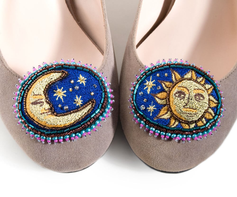 月と太陽の刺繍のぷっくりとしたシューズクリップです。