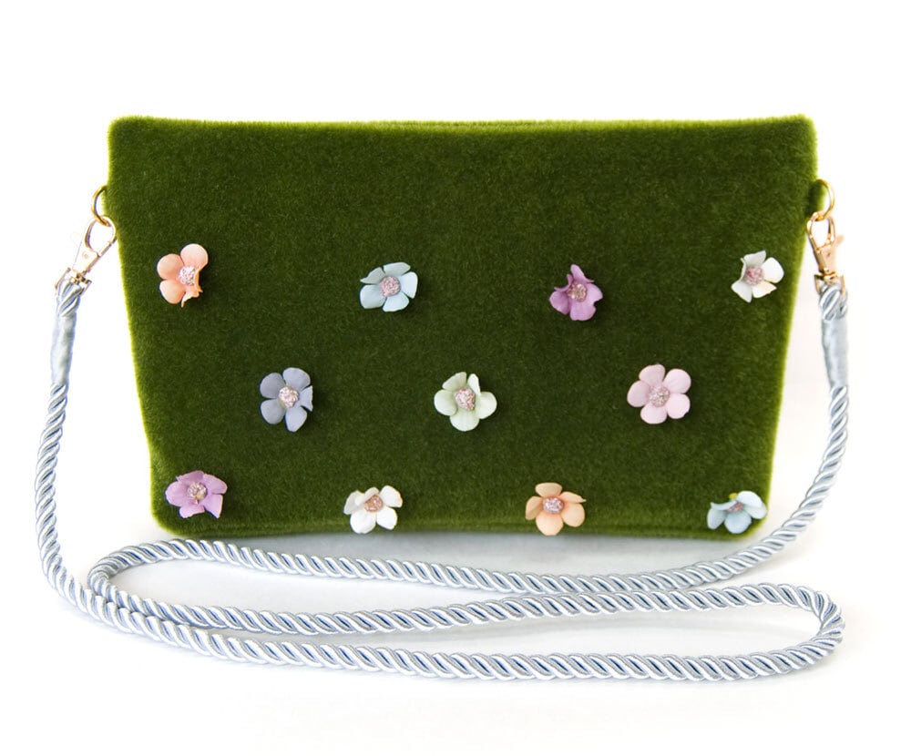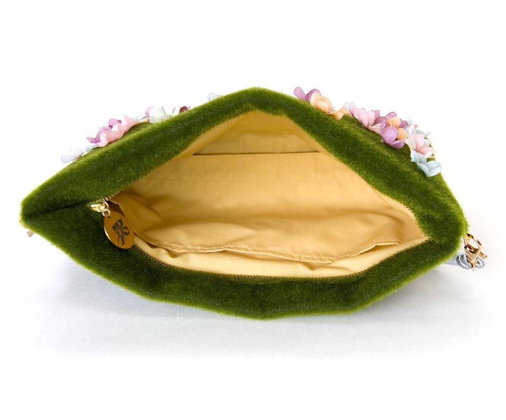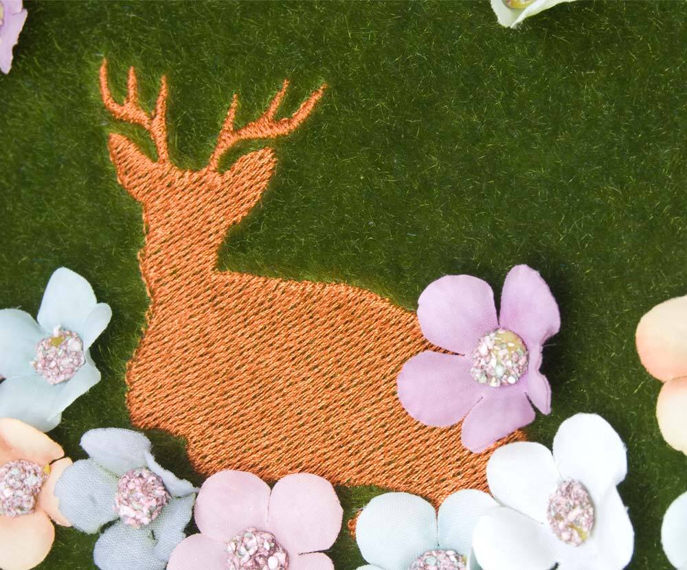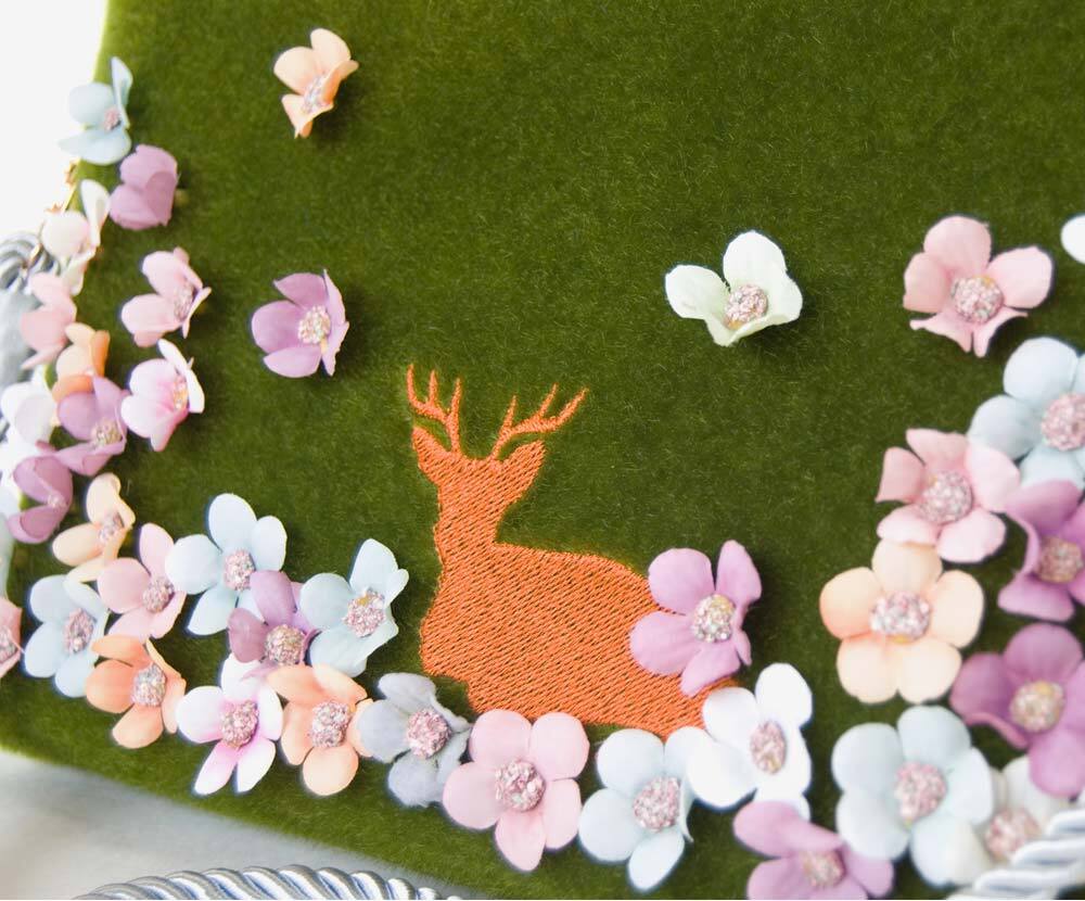 お花の咲いた森で休む鹿のバッグ。
