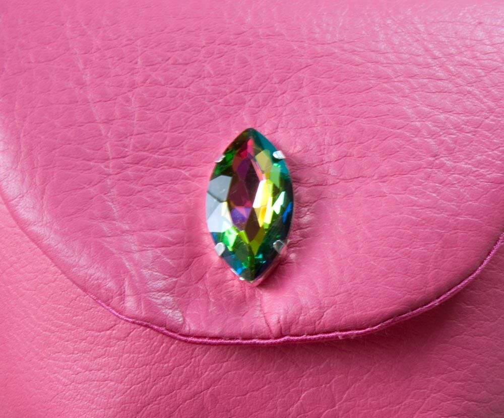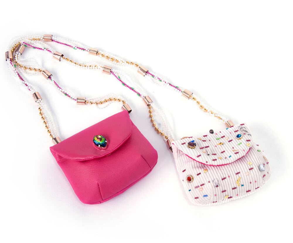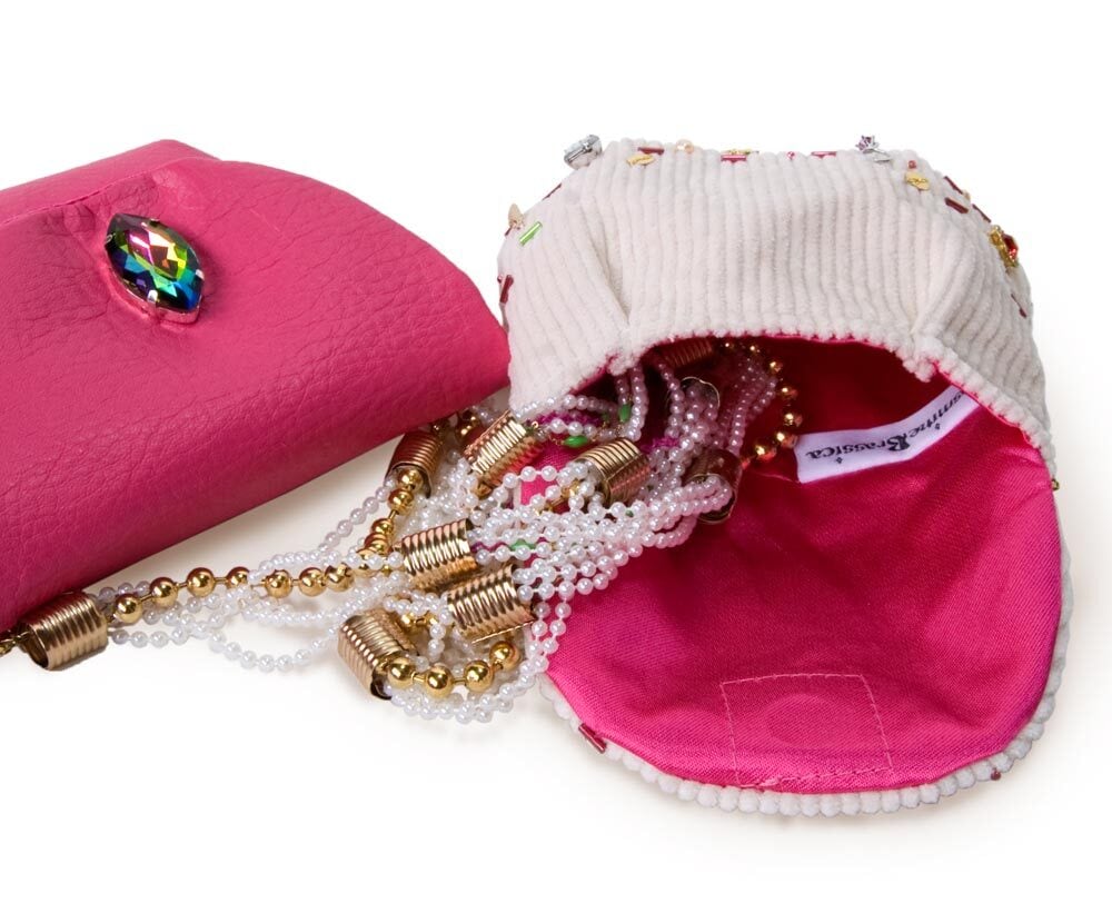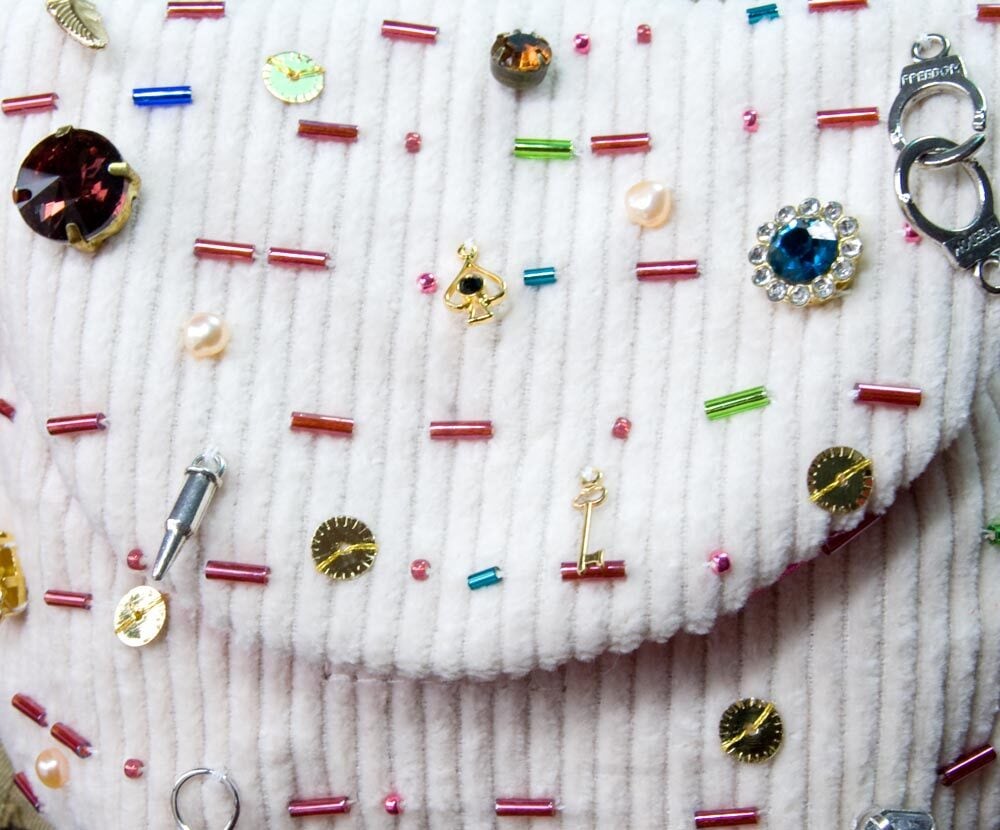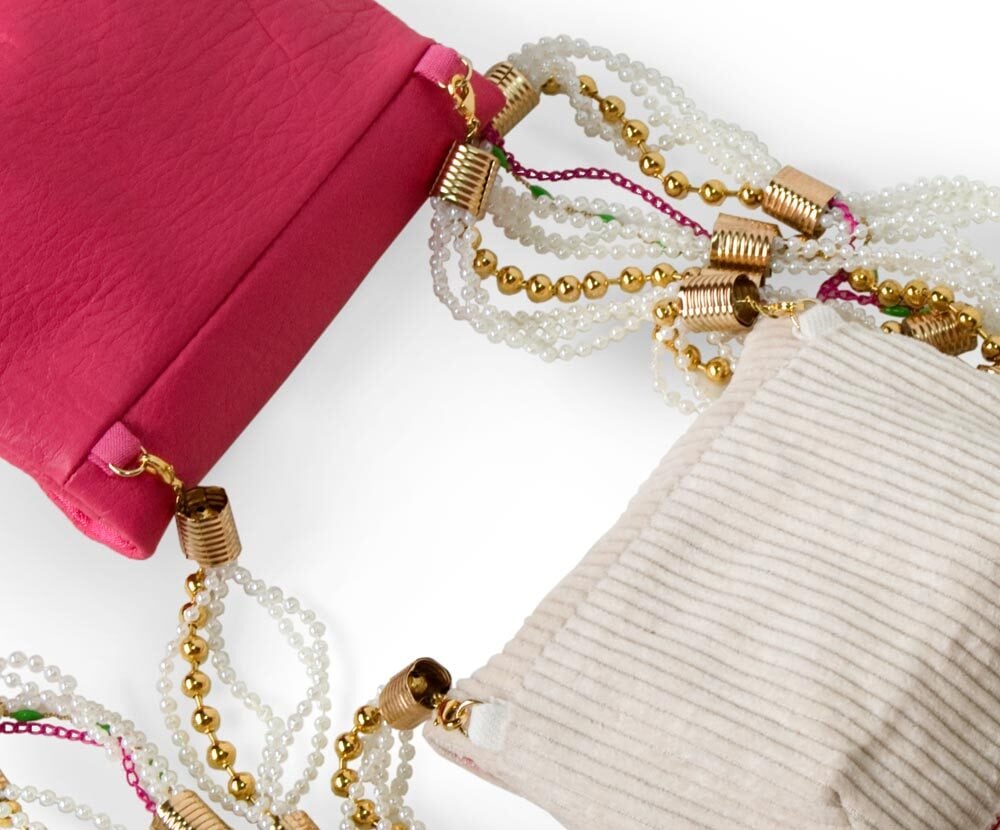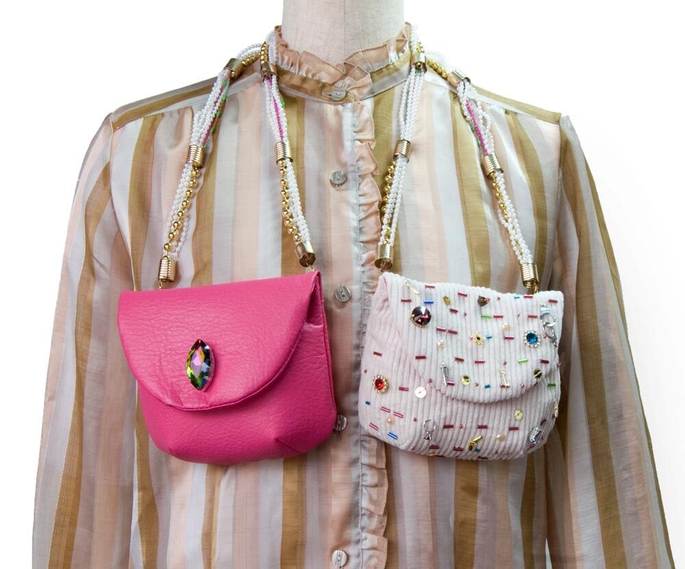 大きなストーンがついたフューシャピンクのインパクトのあるバッグ、オフホワイトのコーデュロイにたくさんのビーズやパーツがカラフルなバッグ、