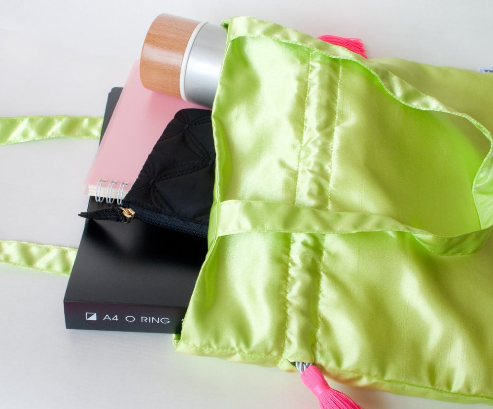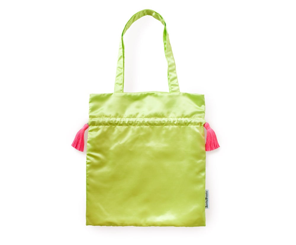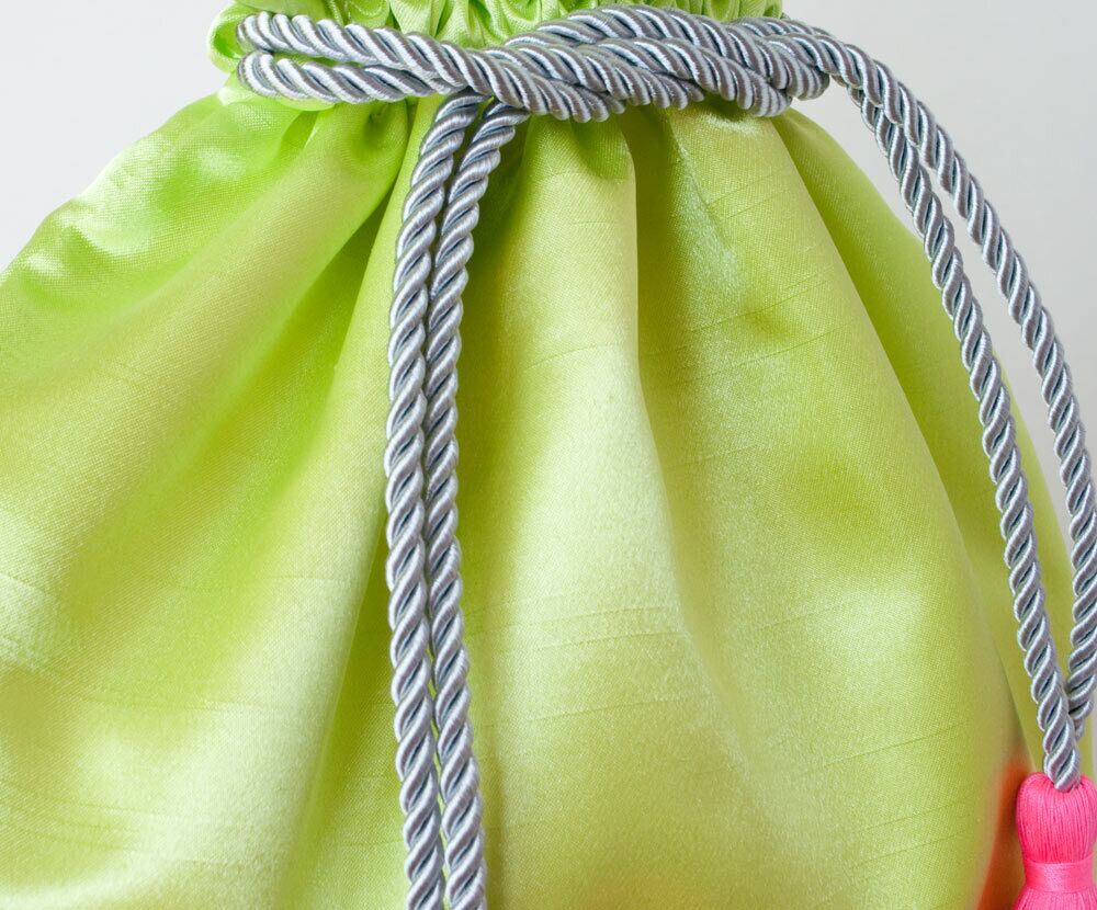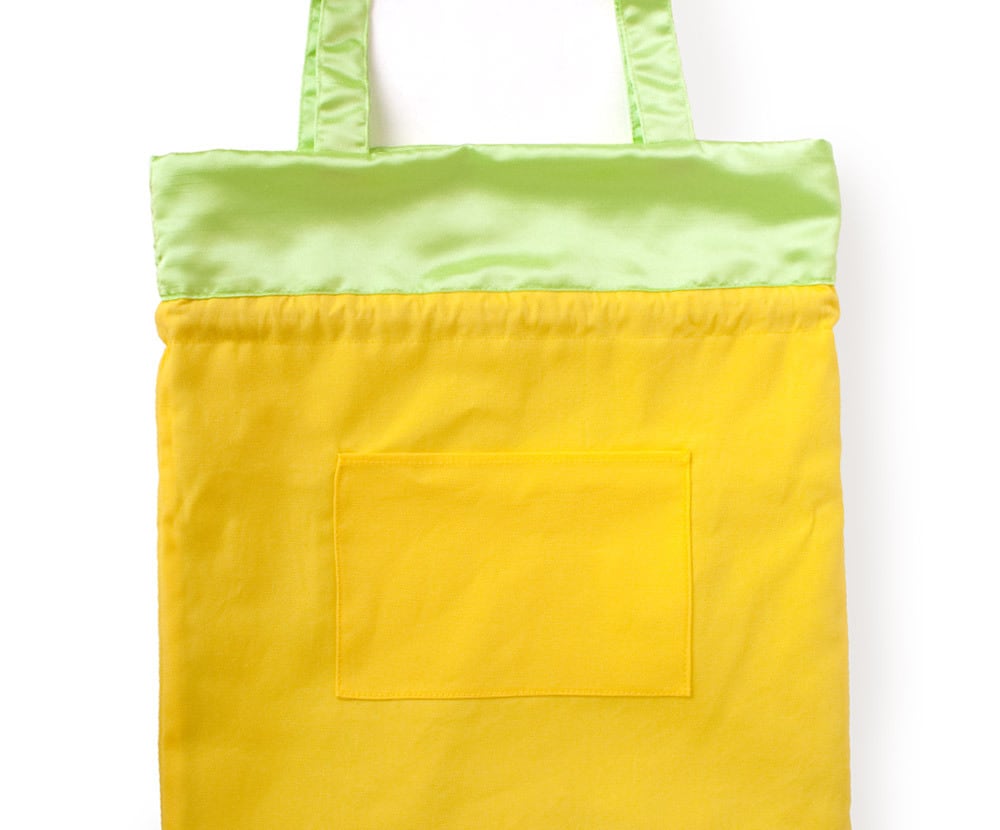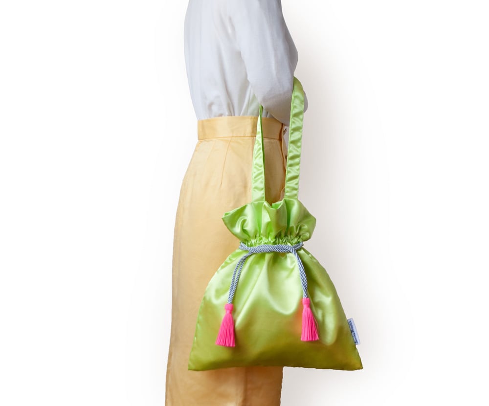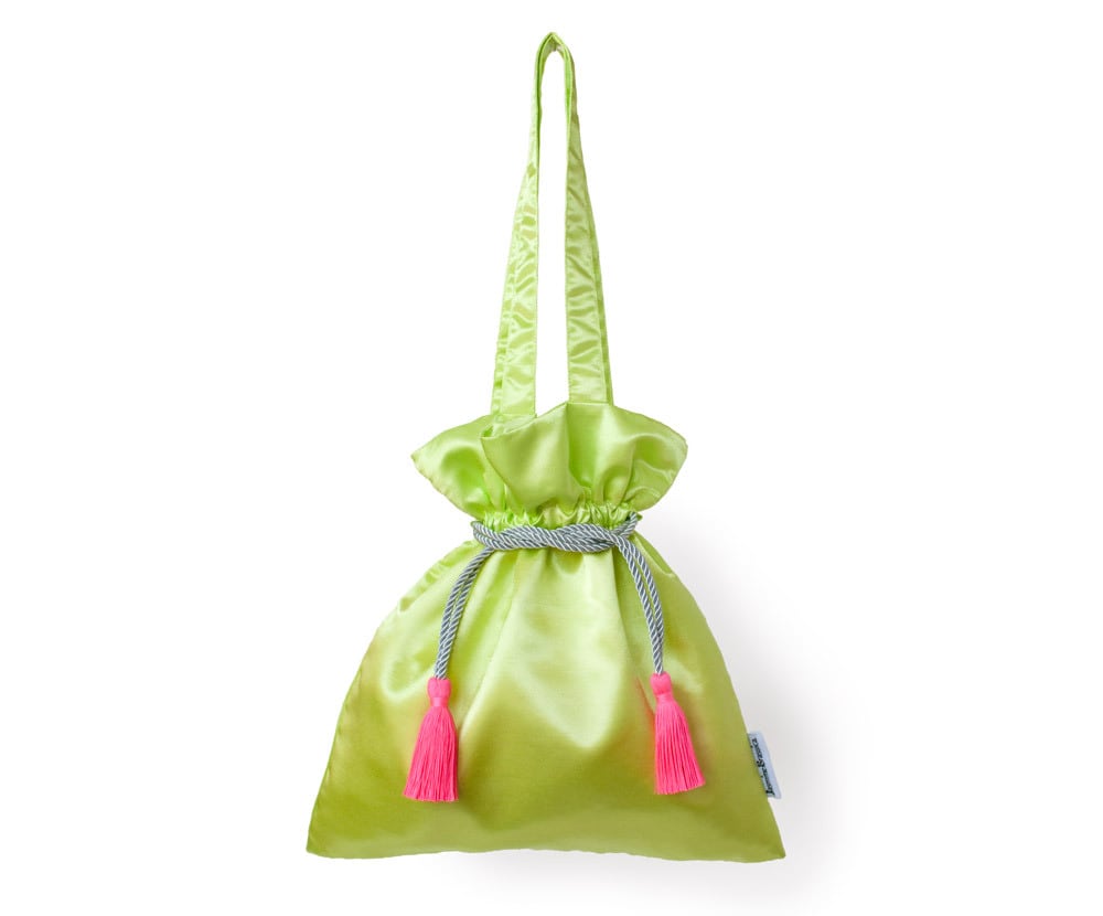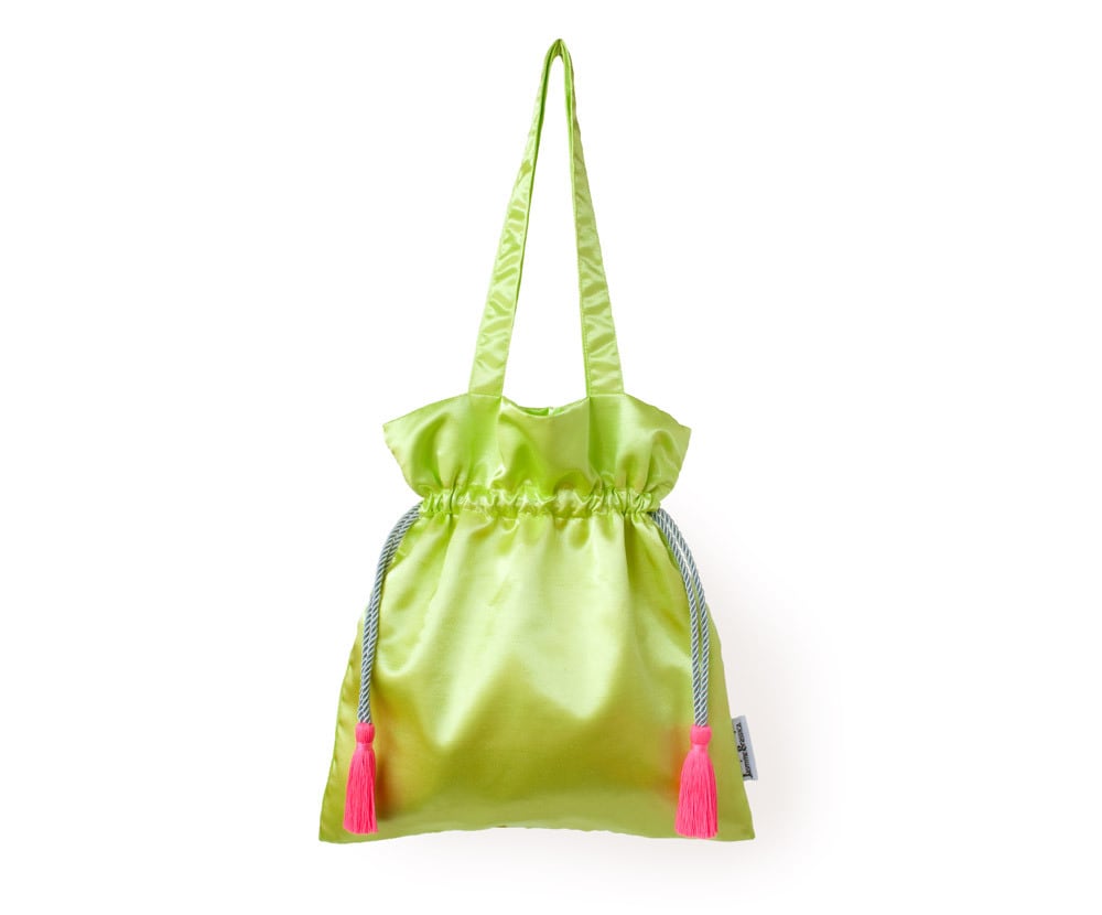 不規則な節があり上品な光沢のあるシャンタンを使用した明るいレモンライムカラーの巾着トートバッグです。