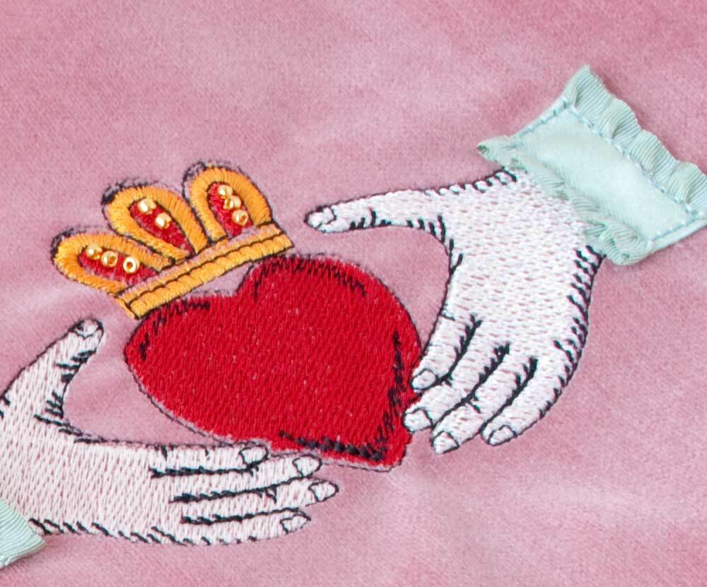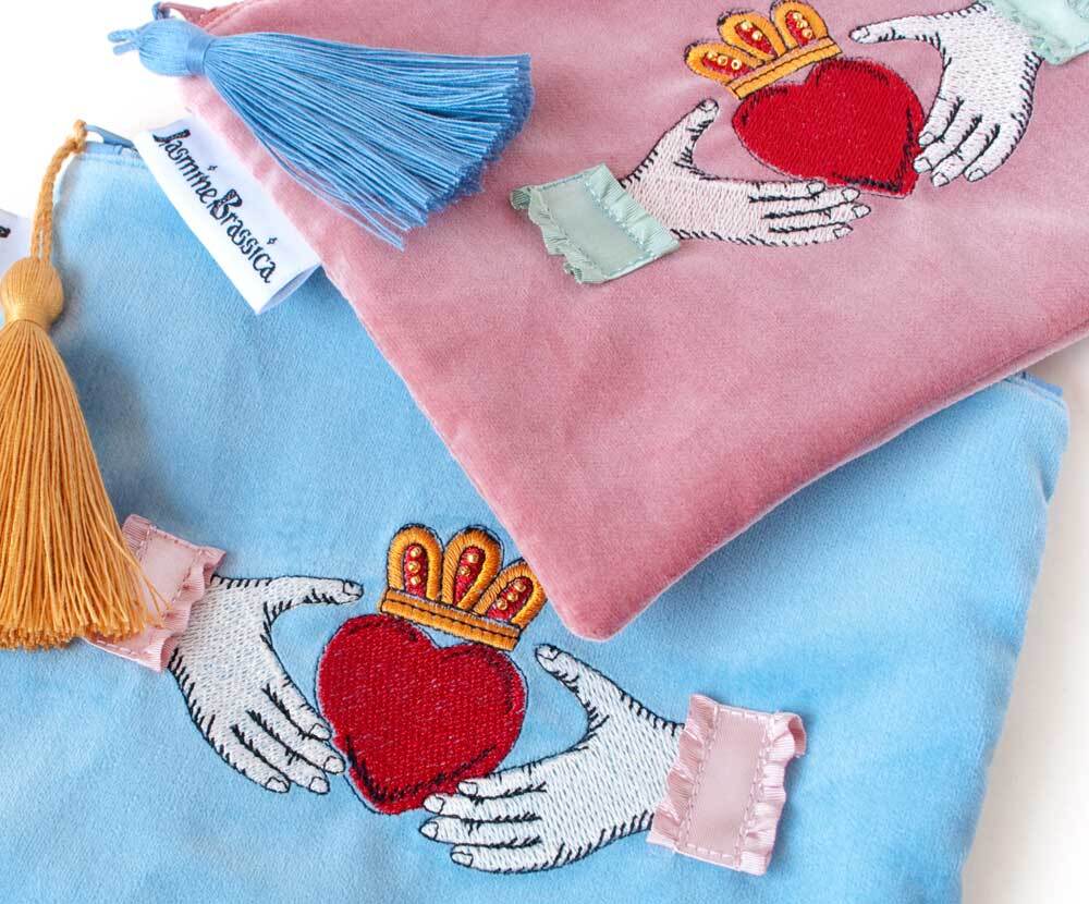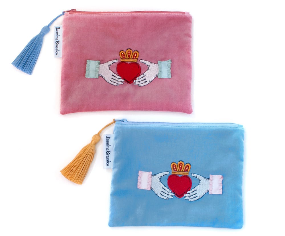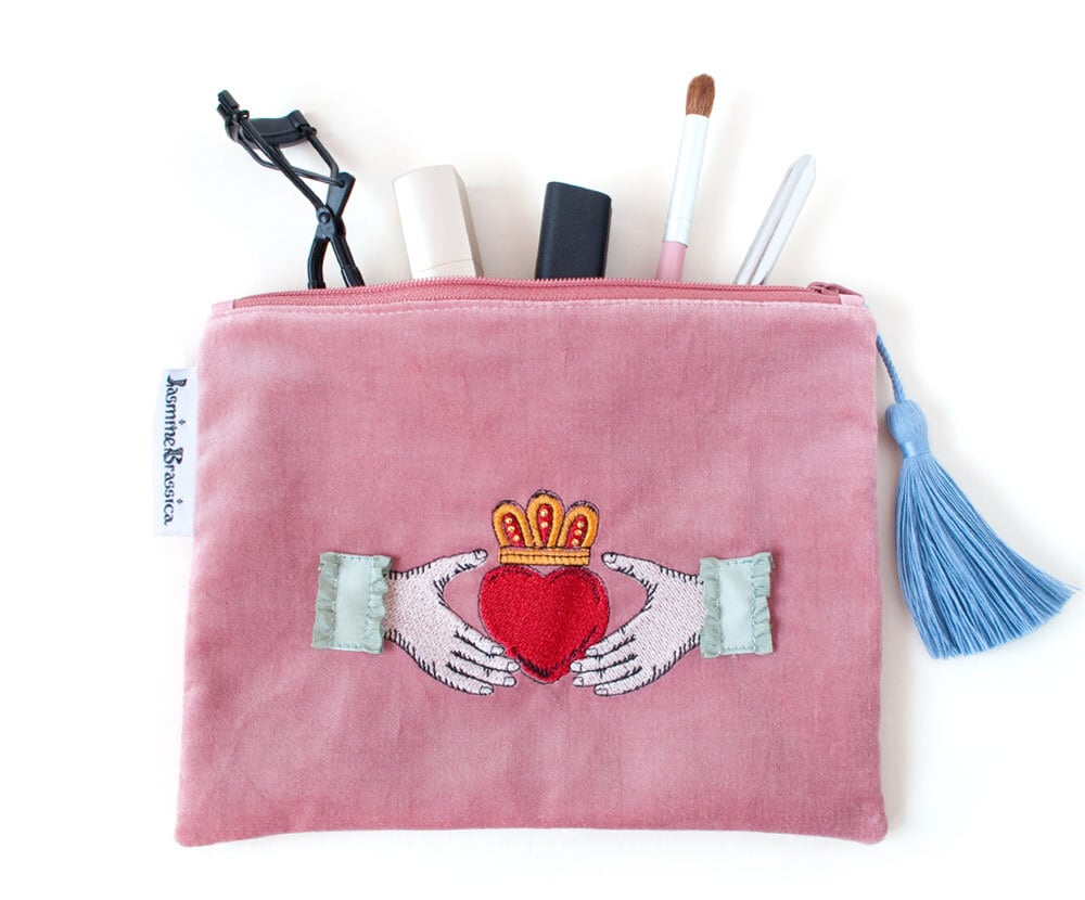 愛と友情、忠誠を意味するクラダリングをモチーフに刺繍したクタッとした柔らかい別珍素材のポーチです。