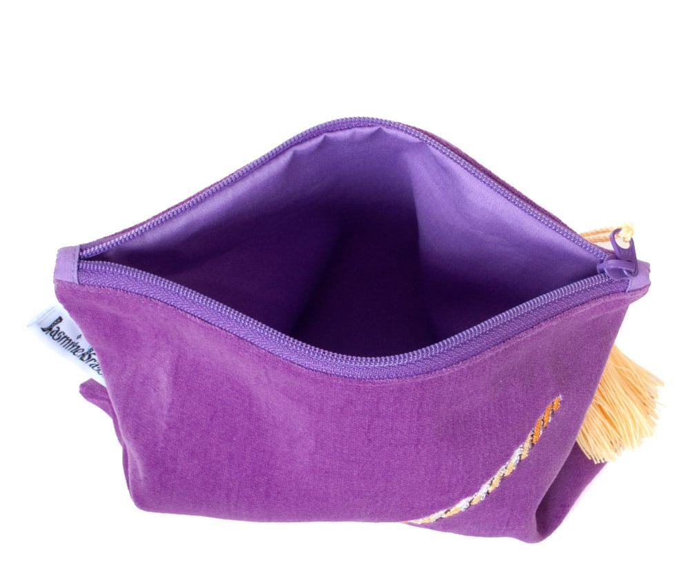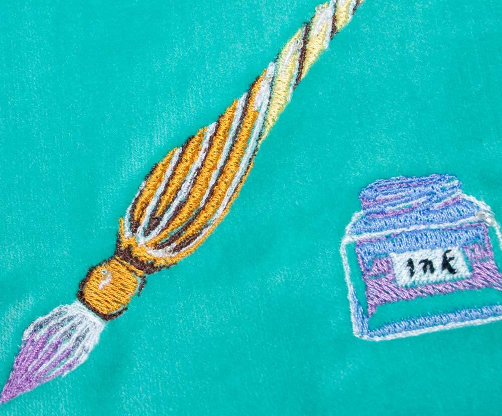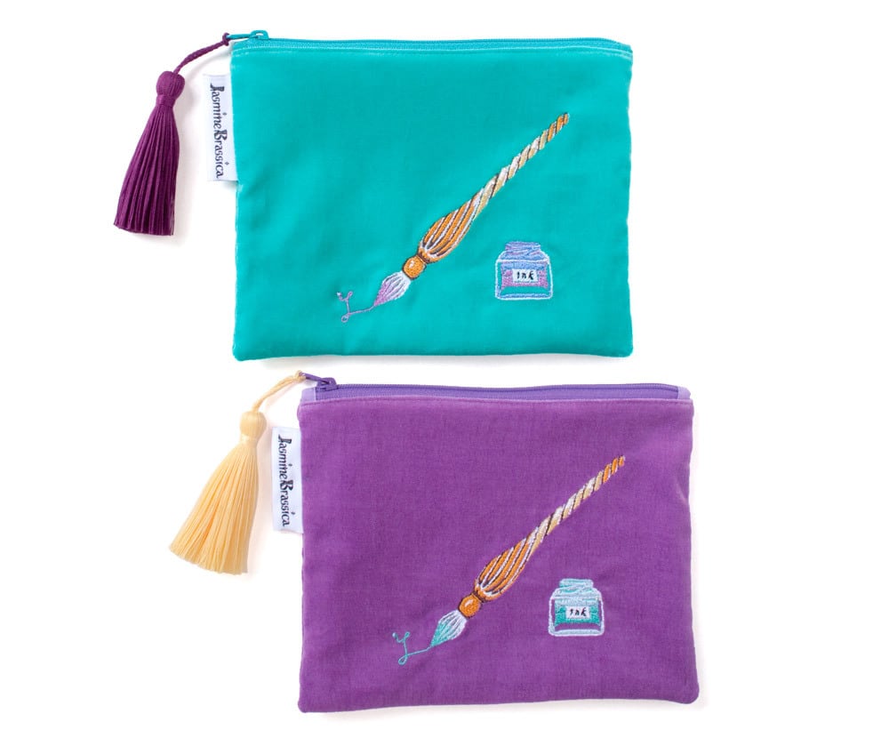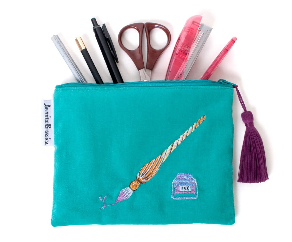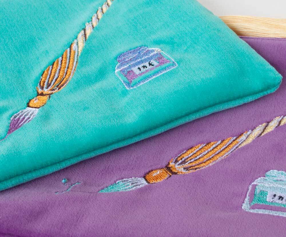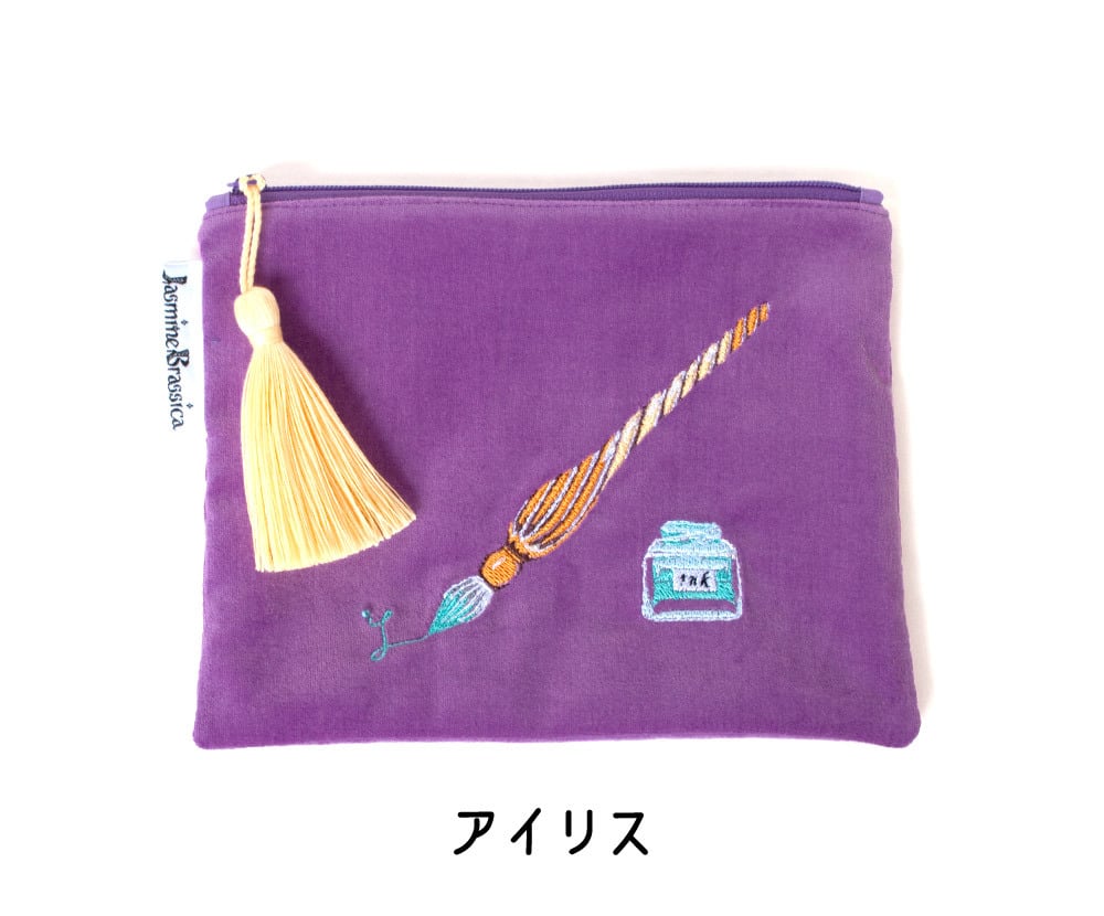 ガラスペンとインクをモチーフに刺繍したクタッとした柔らかい別珍素材のポーチです。