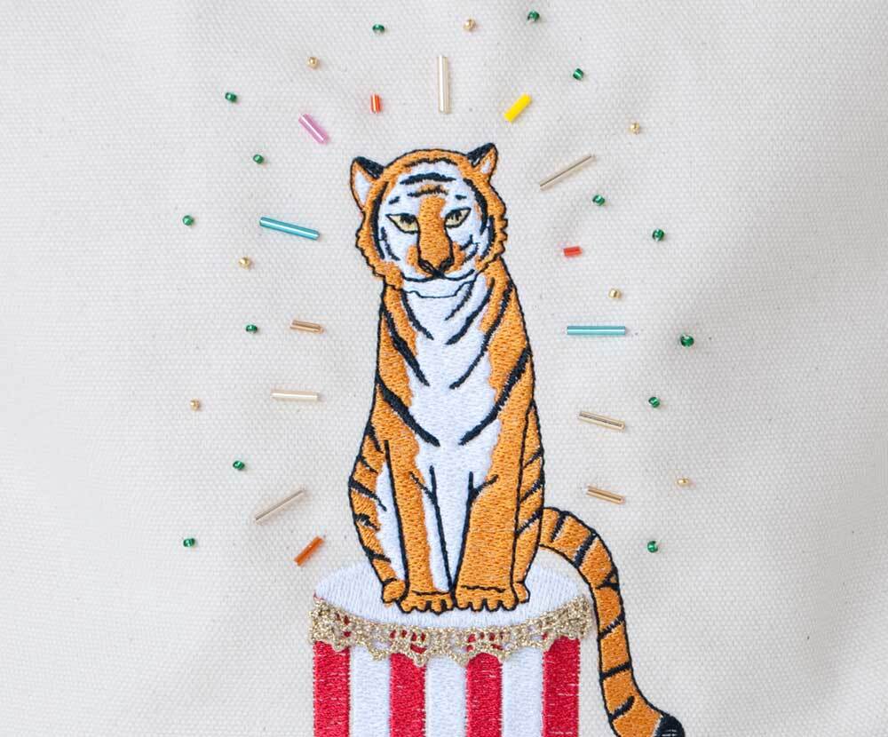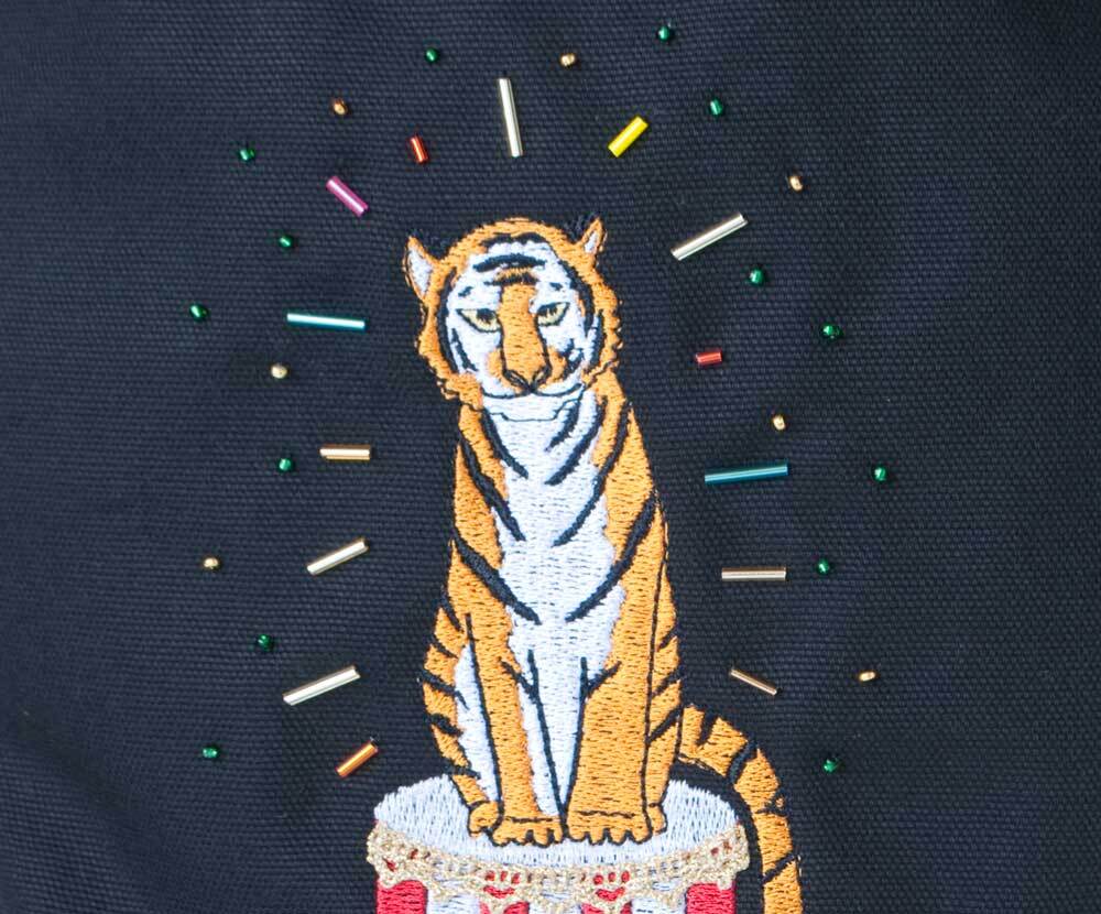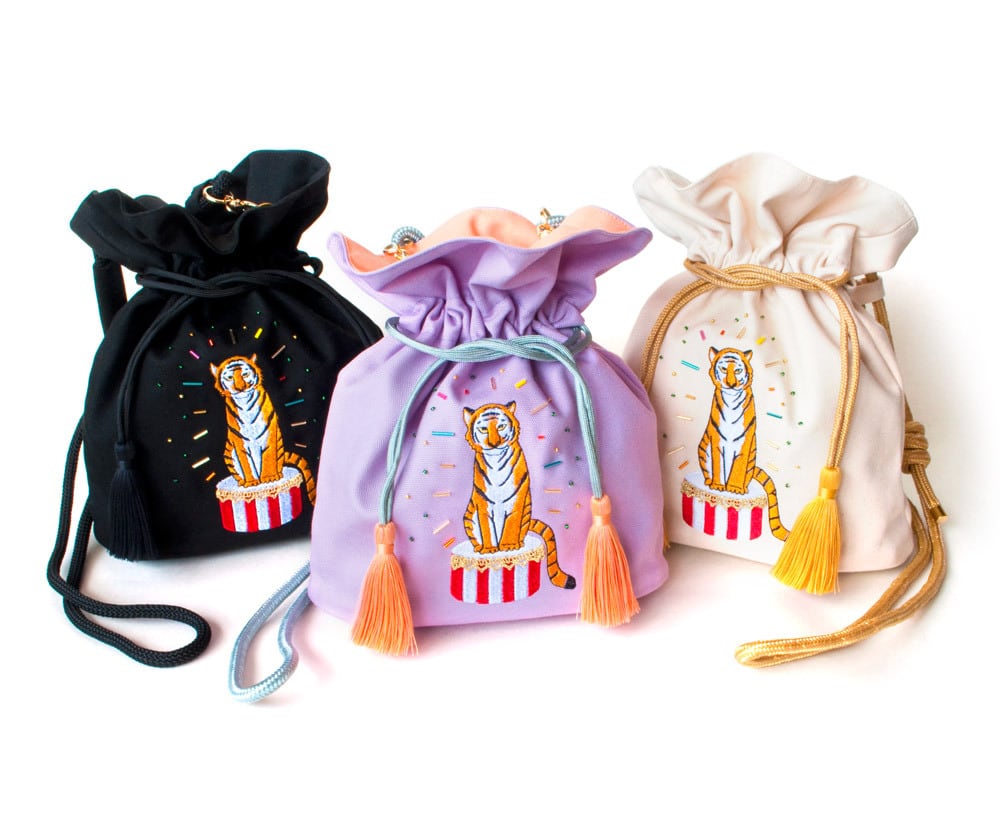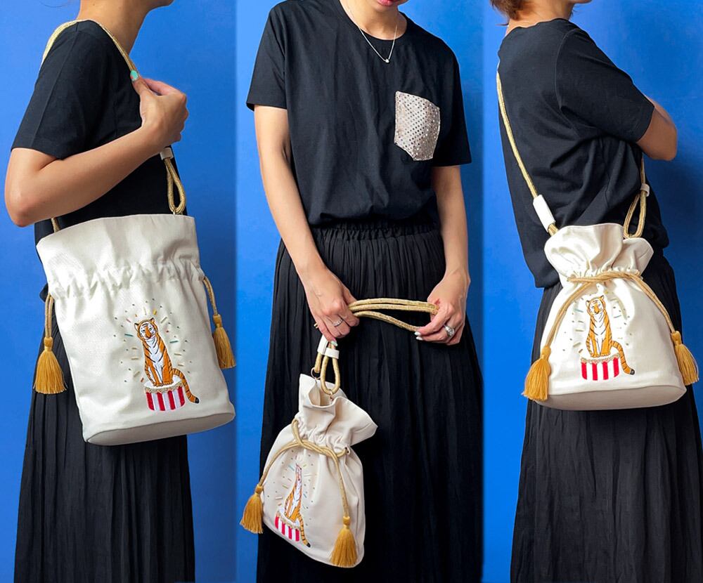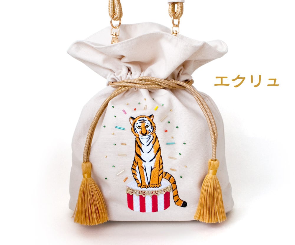 サーカスの虎をイメージした刺繍にビーズをあしらった、タッセルがついた巾着バッグです。