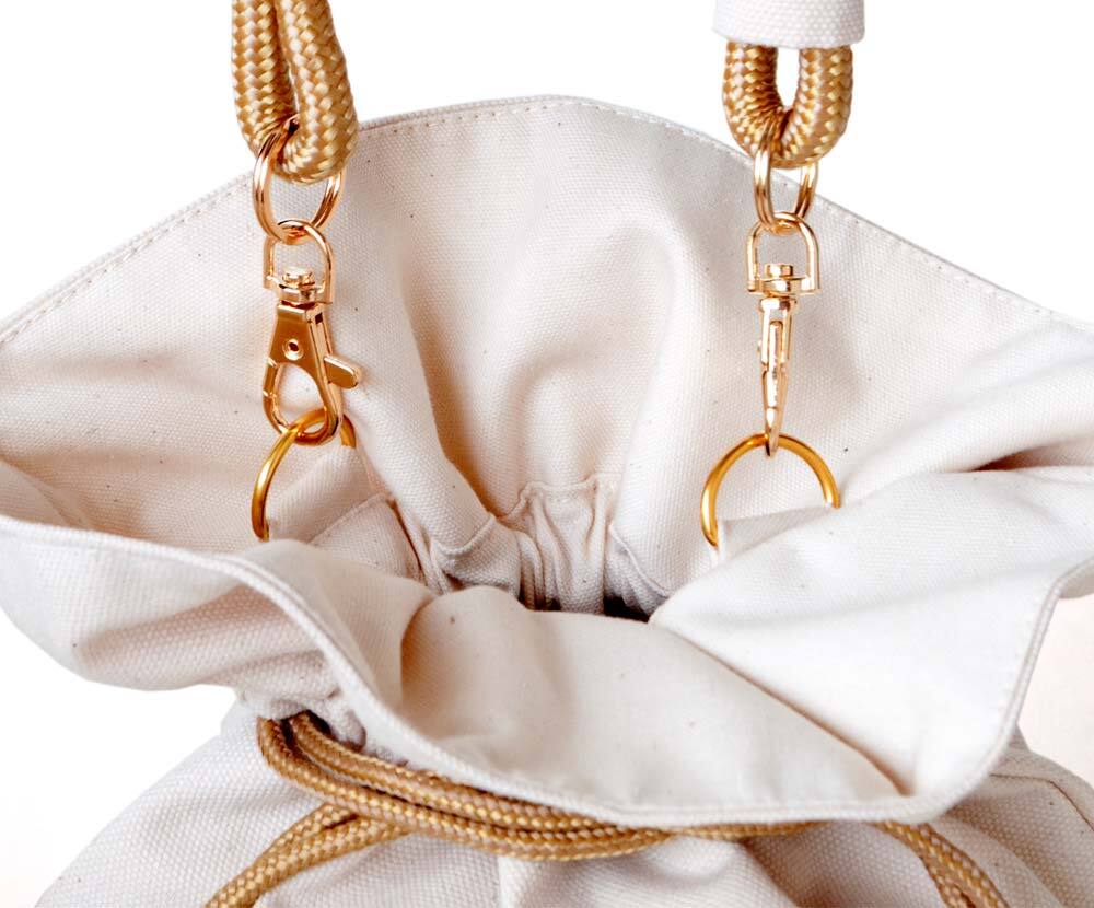 ナチュラルな生成りのエクリュには同色の裏地にタッセルと紐にはマスタードカラーを。