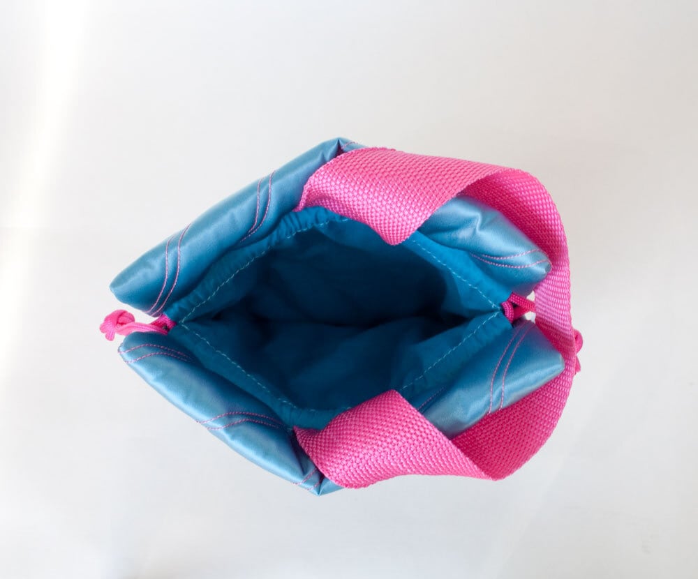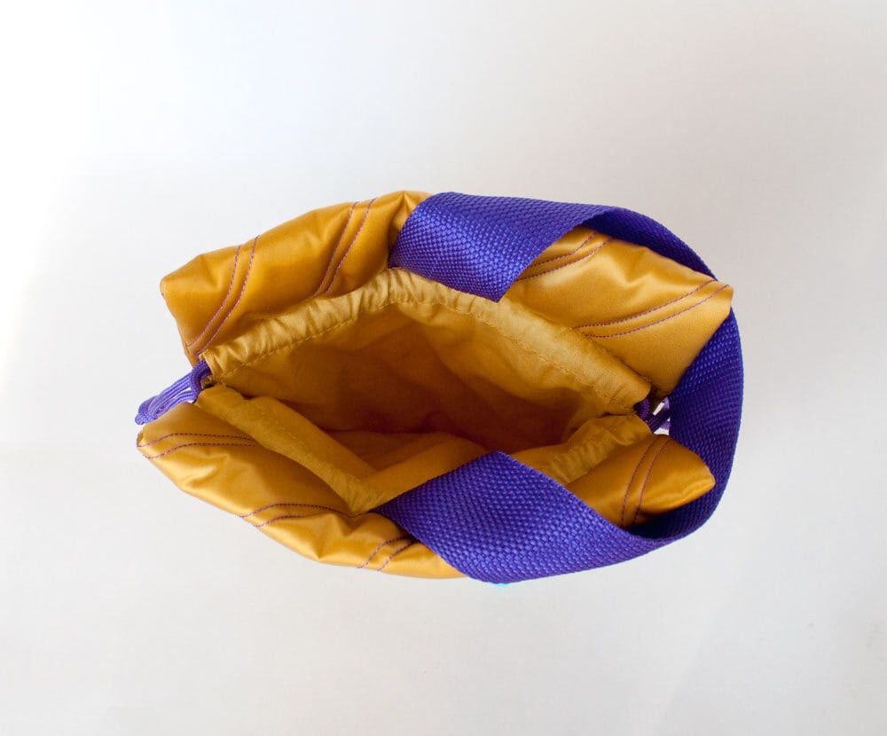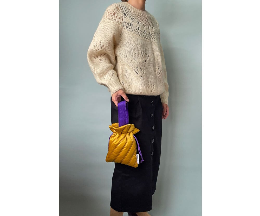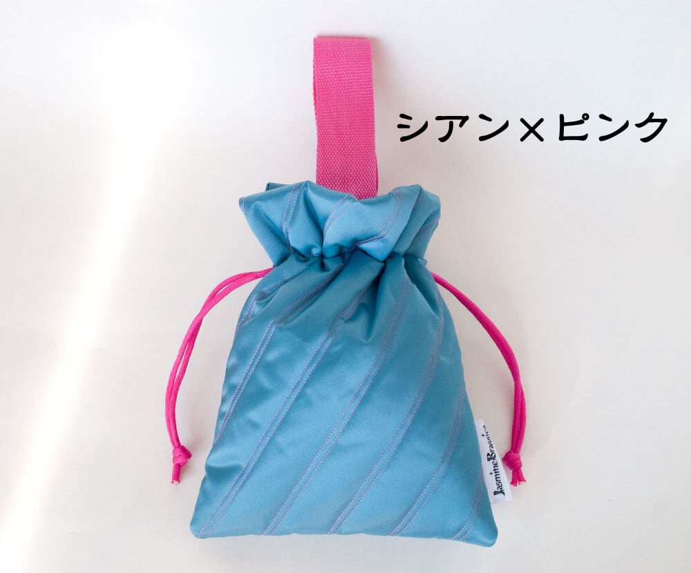 光沢のあるキルティング生地の小さめ巾着バッグです。