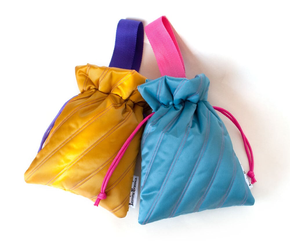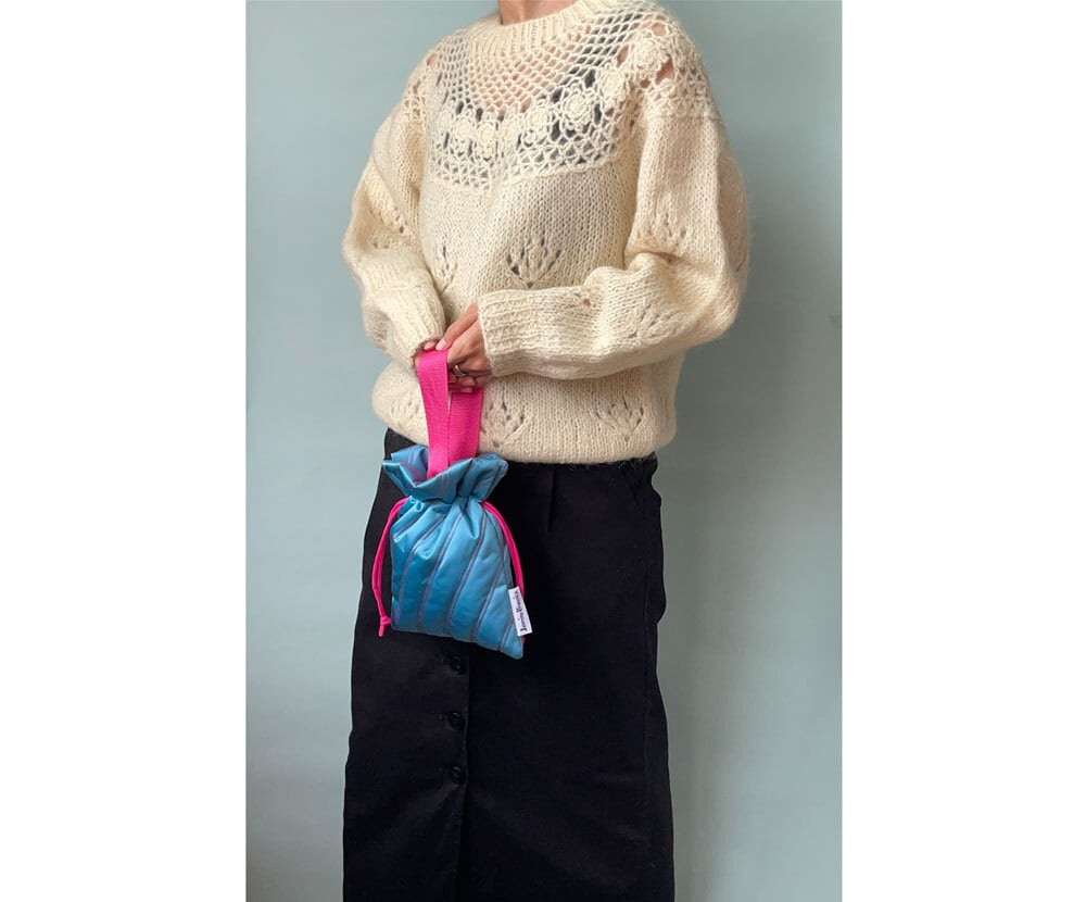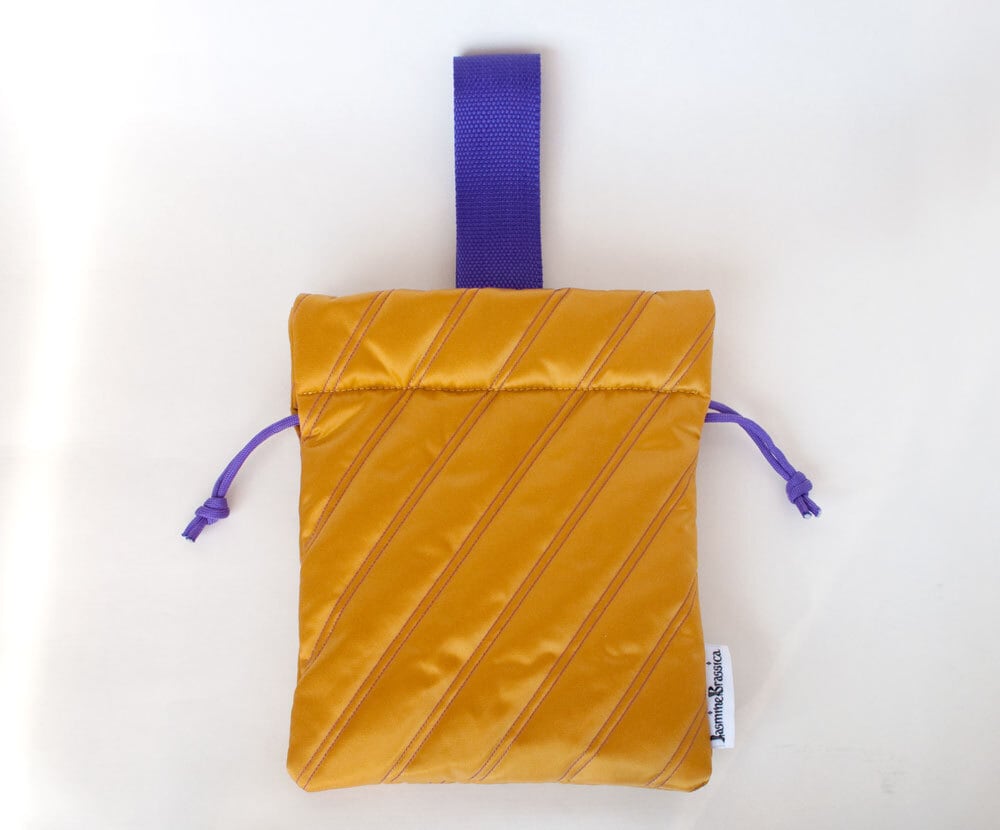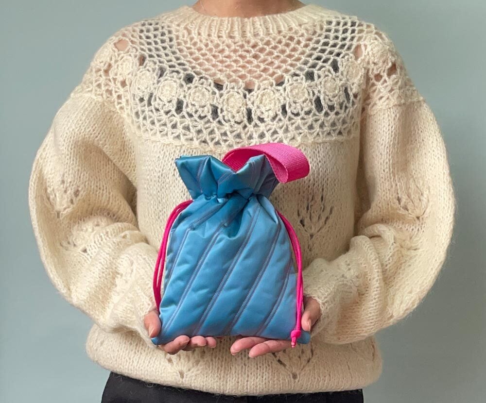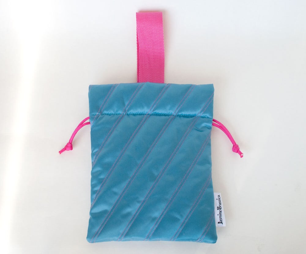 光沢のあるキルティング生地の小さめ巾着バッグです。