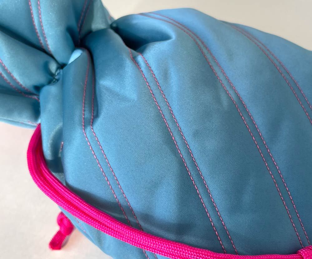 持ち手と紐とキルティングの縫い目が鮮やかなピンク色の