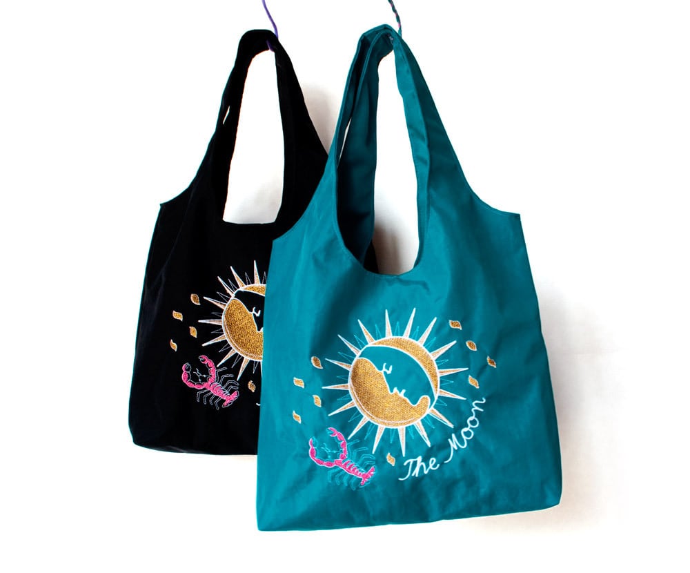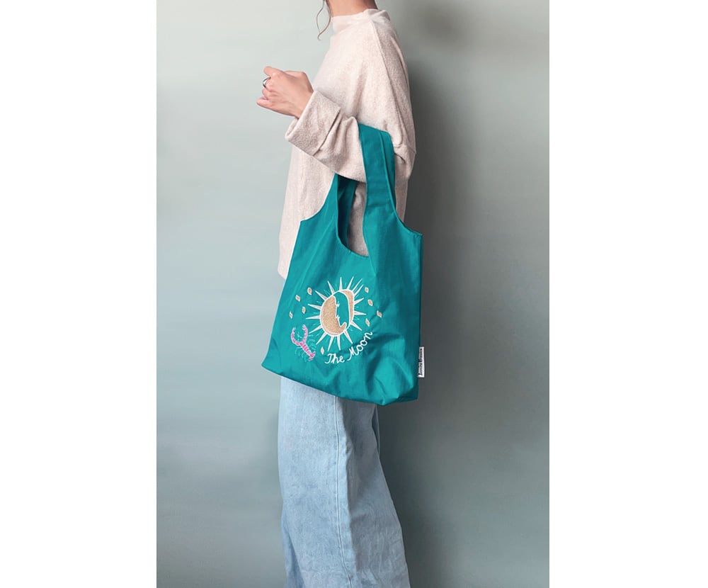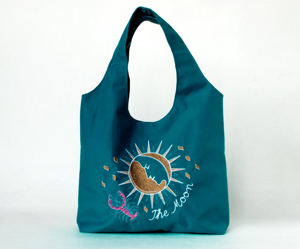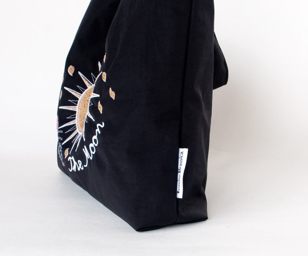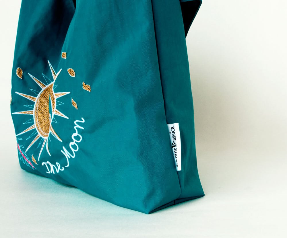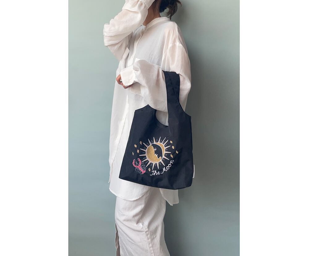 タロットカードのムーンをモチーフに刺繍した軽いのにしっかりとしたナイロン素材のバッグです。