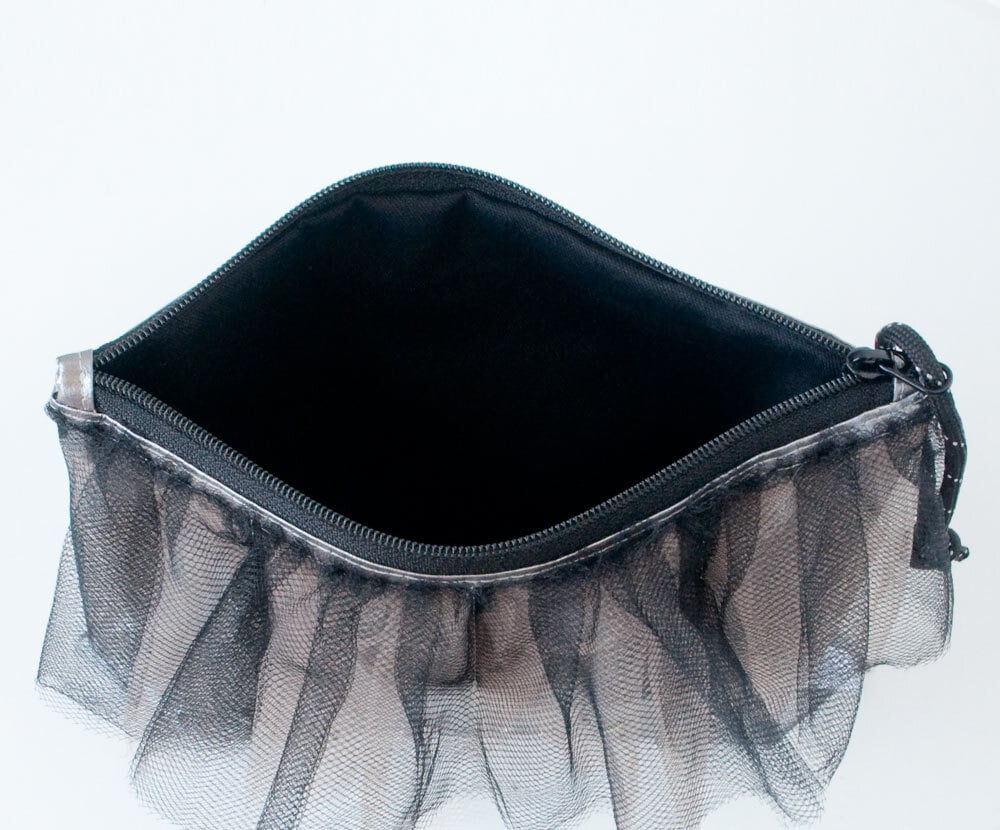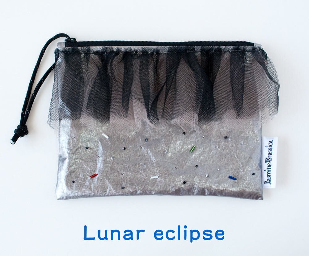 漆黒の黒と影のようなグレーのチュールを合わせて、満月の頃に地球の影に月が入り暗くなったり欠けたりする神秘的な月食をイメージしています。