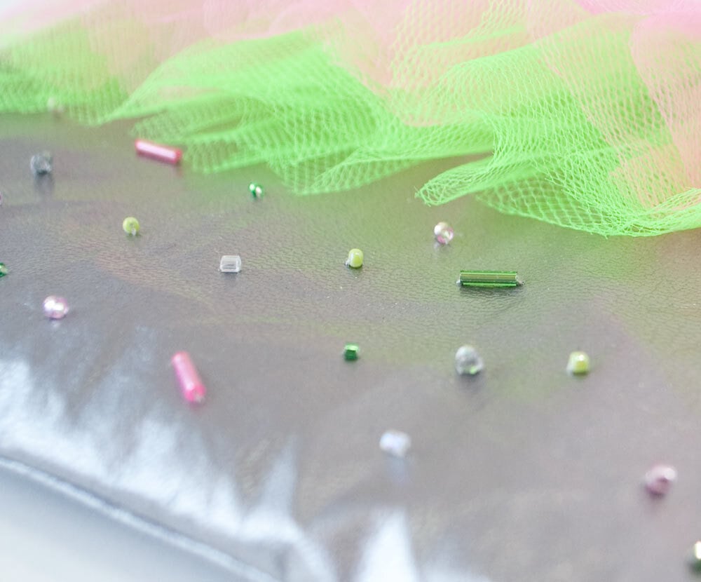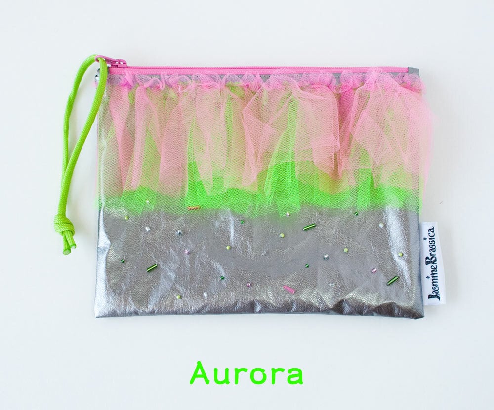 可愛いピンクとライムグリーンのチュールを合わせて、プラズマと大気がぶつかって発光する幻想的なオーロラをイメージしています。