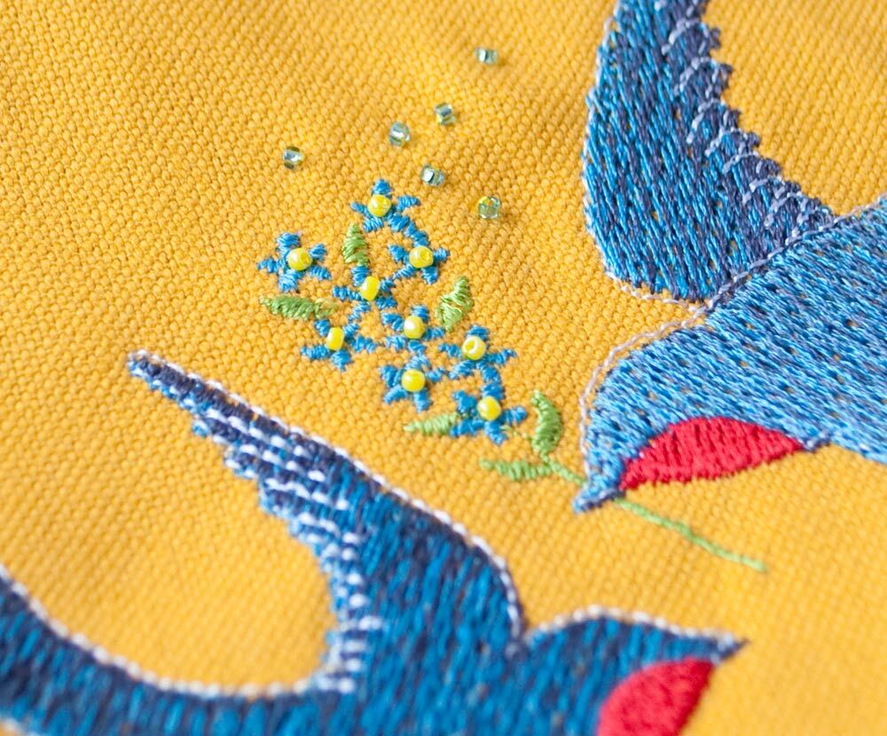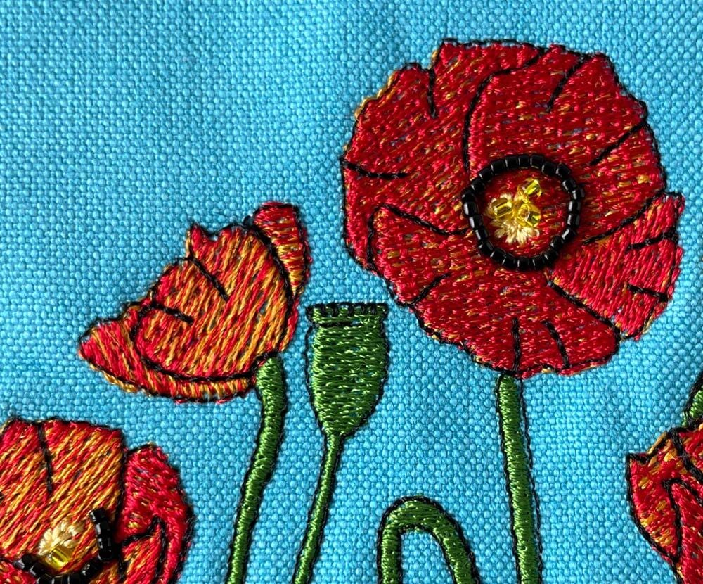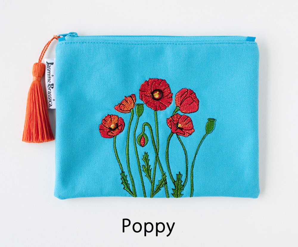春の可愛いお花、ヒナゲシとも呼ばれ、「恋の予感」「七色の恋」などの花言葉を持つ可憐なポピーですが毒や麻薬成分がある種類もあるという、ミステリアスなお花の刺繍です。