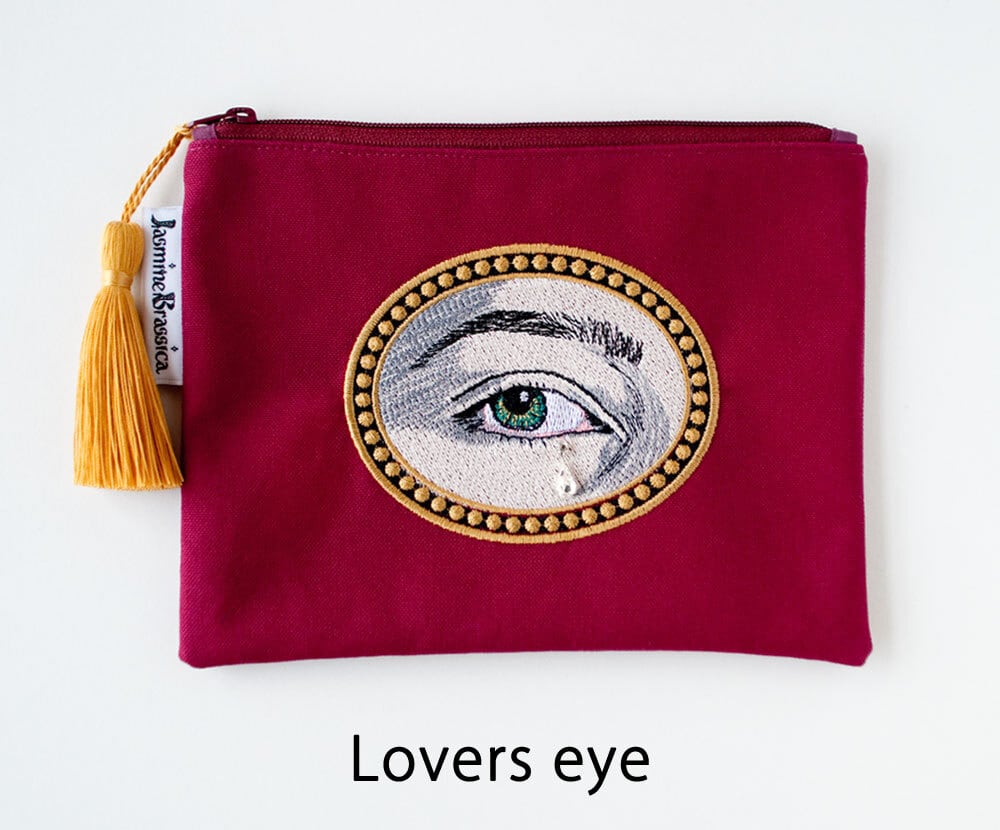 18世紀後期のイギリスから流行した、身分違いなどで結婚できない恋人や秘密の恋人に贈った人、貰った人にしか相手が分からないように自分の目だけの肖像画で作ったアクセサリーを贈ったり、交換したりしていたという切なくてロマンチックなラバーズアイのモチーフです。