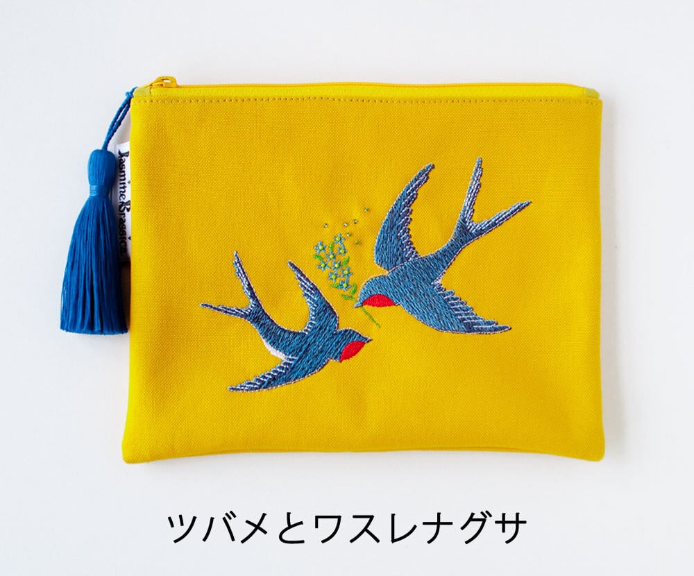 春の訪れを告げるツバメが小くて可愛い水色のお花、「私を忘れないで」「真実の愛」「真実の友情」などの花言葉を持つワスレナグサをくわえて飛んでいるモチーフです。